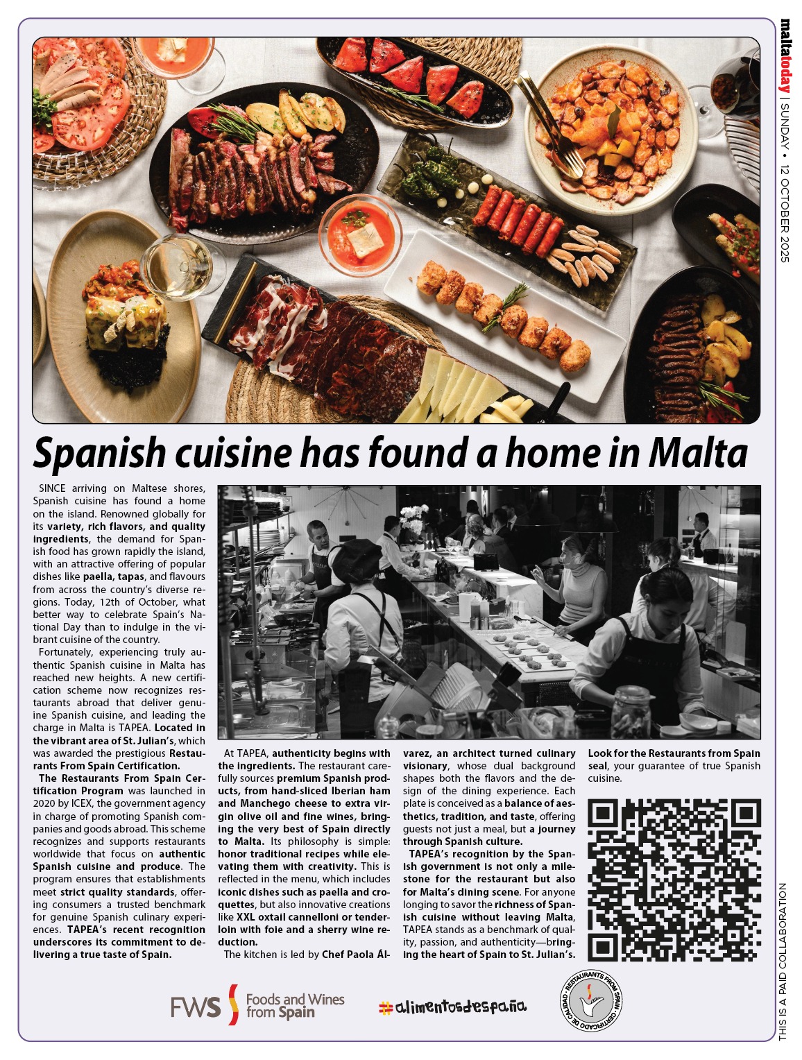 Spanish cuisine has found a true home in Malta, and this Spain’s National Day, TAPEA in St Julian’s celebrates the honour of being officially certified by the Restaurants From Spain programme, marking a new milestone for authentic Spanish dining on the island.