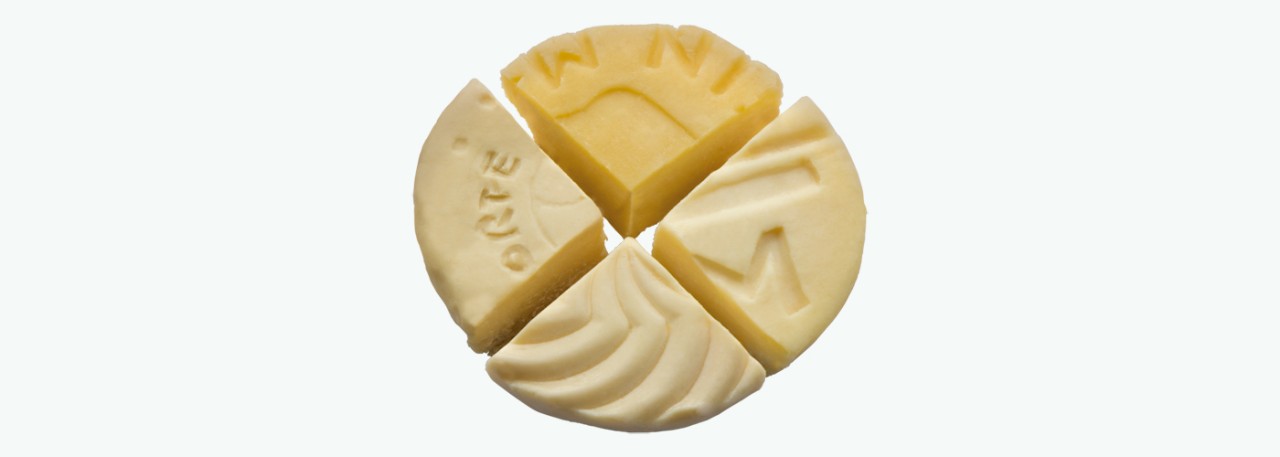 The rind is virtually non-existent since, after repeated kneading, the cheese matures uniformly and at the same rate inside and out. Its exterior and interior form a compact, bound mass, which is clean, dry or slightly oily.