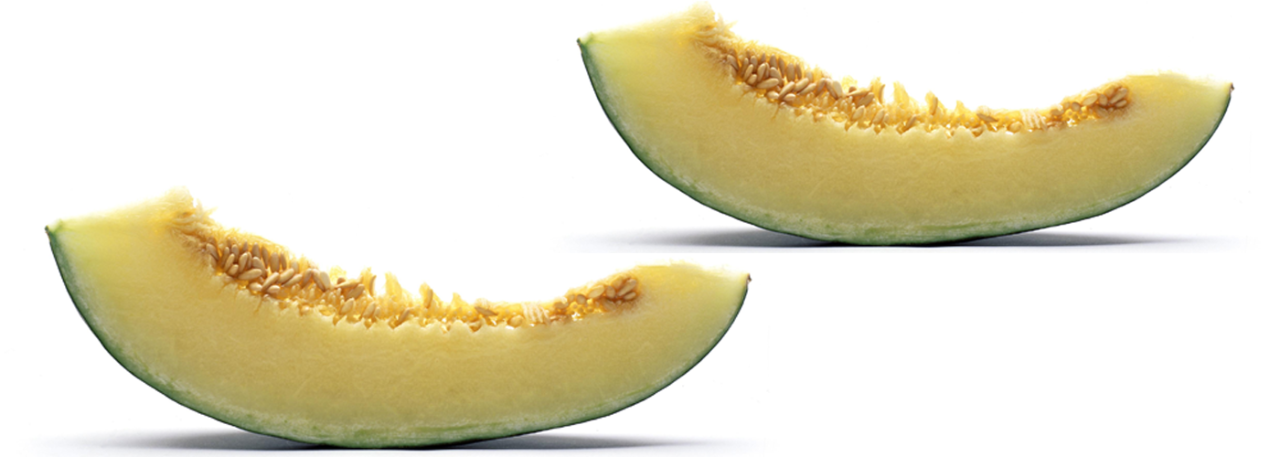 From a sensory point of view, the main characteristics are its sweetness, its juiciness and the low level of fibers in its flesh. The skin can be smooth or slightly rough and is between 0.6 and 0.8 cm / 0.2-0.3 in thick. It is netted or has grooves of varying intensity that run lengthways, and this is usually more abundant around the stalk area and the scar left by the stigma. It is mainly green in color with some medium-sized shadows that are distributed uniformly and turn yellow as it ripens. The flesh is white or cream-colored. The placental zone is in the central cavity, which is orange-colored and relatively small in comparison to other varieties; the seeds are here.