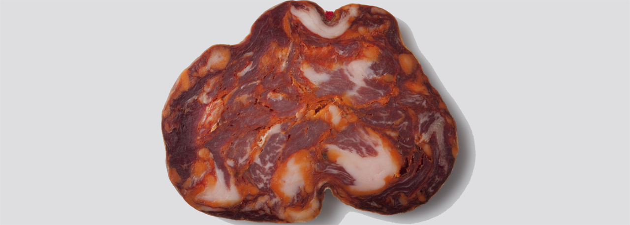 It has a firm consistency and when sliced it has a deep red color, with an even surface and a marbling of fat throughout the meat.