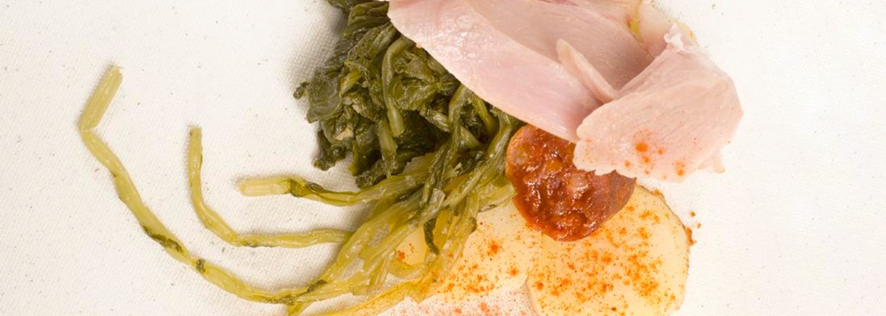 Leave the ham to soak in cold water for two days. Place in a pan with water and simmer for 3 hours. Remove and set aside. Cut and wash the turnip tops. In the cooking water used for the ham, place the lard and cook the turnip tops, chorizos and finally the potatoes, making sure they do not break up.