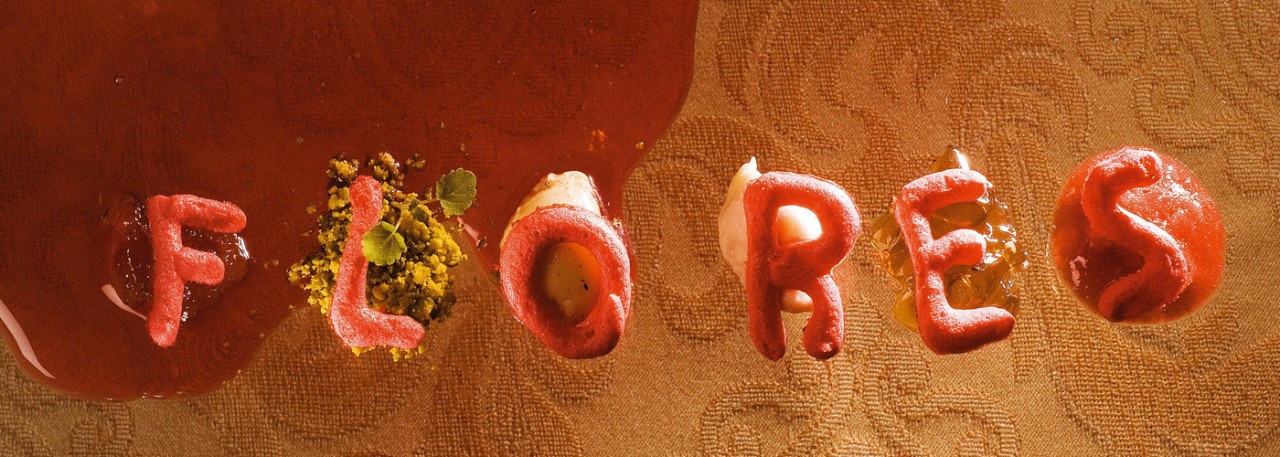 Beat the egg whites with the sugar, then add the superfine sugar and then the coloring. Gradually fold in using a spatula. Bake at 100ºC / 212ºF. Cut to form the letters of the word “flower”.